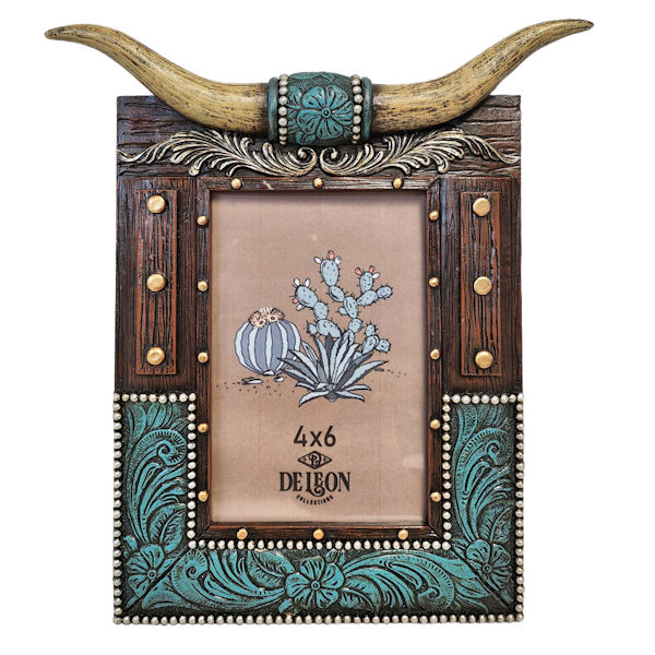 D14814-HORNS & TOOLED LEATHER 4X6 PHOTO FRAME
