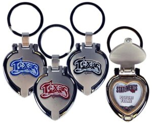 Collectible Texas souvenir Keep your loved ones in your heart with this heart locket keychain. It has a magnetic closure and comes with the state name in 3 assorted colors per dozen. 12 pieces in inner pack 144 per case.