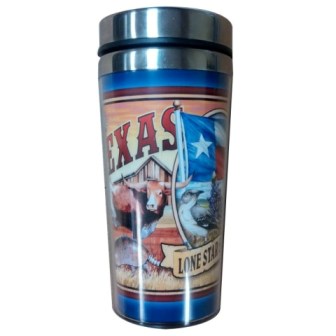 Collectible Texas souvenir Best seller! Double wall 14 ounce travel mug with stainless steel inner and plastic outer shell. Individually packaged in white box.