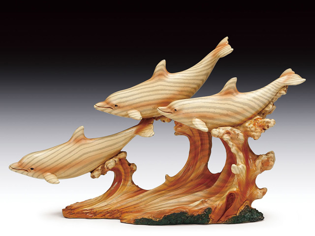 PDJ781-THREE DOLPHINS W/WAVE, WOOD-LIKE CARVING