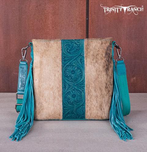 TR159G-9360TQ-Trinity Ranch Hair-On Cowhide/Tooled Fringe Concealed Carry Crossbody Bag