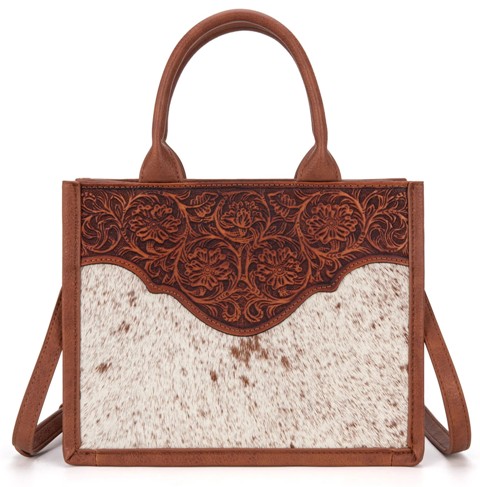 - Genuine hair-on cowhide and floral tooled