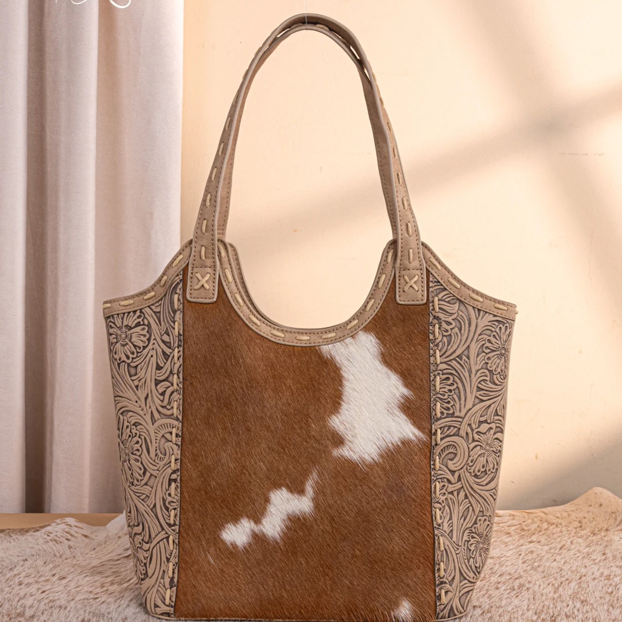 - Genuine hair-on cowhide on the front