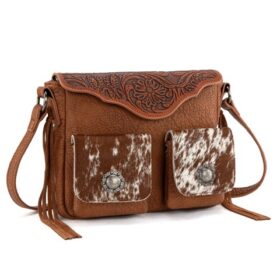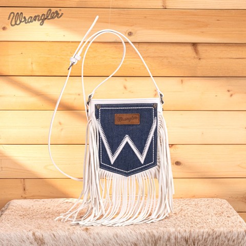 WG367-8360BG- Wrangler Leather Fringe Jean Denim Pocket Crossbody -Beige