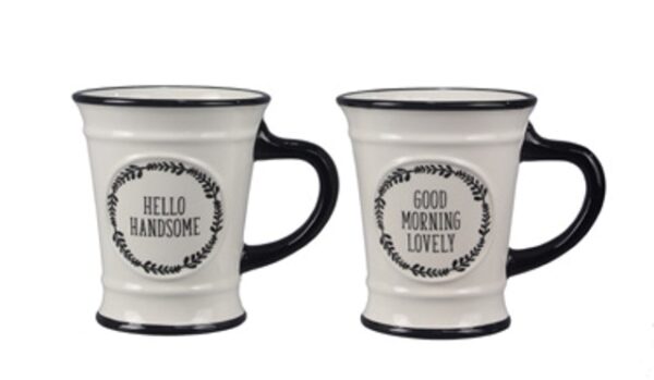 These mugs will bring a smile to your face featuring ” Hello handsome”, “Good morning lovely” in black script. A lovely way to start a day with your partner.