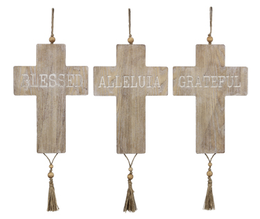 - Wood cross wall sign with tassel that comes in 3 assortments